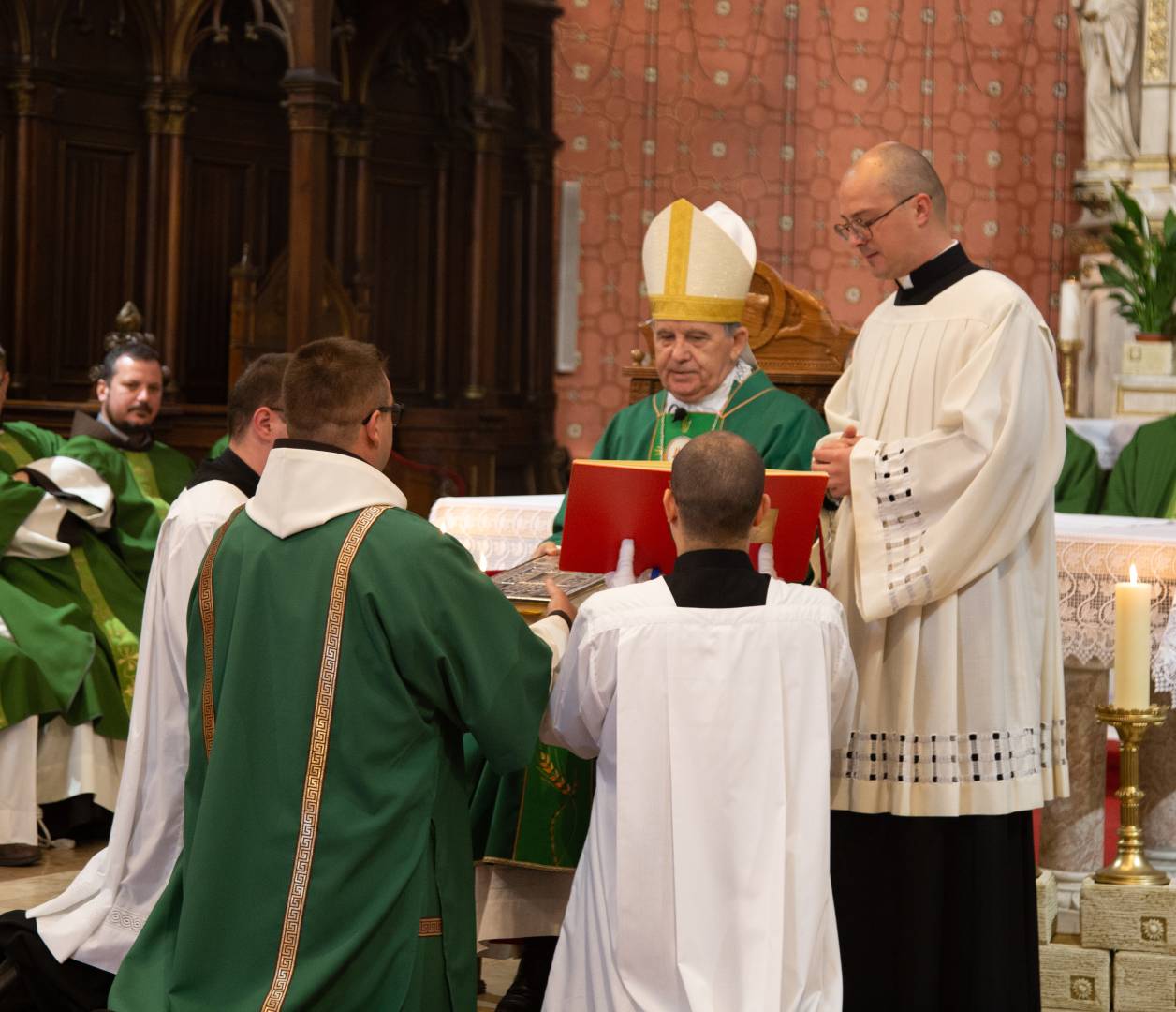 Nakon što je vlč. Josip Knežević navijestio evanđelje, rektor Spajić i meštar Nikolić predstavili su kandidate za red đakonata te su posvjedočili da su kandidati prikladni za đakone. Uslijedila je homilija nadbiskupa Vukšića u kojoj je kazao da su kandidati danas od svete majke Crkve dobili dar, dar koji liči na jedan nepovratni kredit sa željom da ga iskoriste kao duhovno sredstvo za svoje napredovanje u poniznosti i za služenje onima kojima je to potrebno. Također je kazao, osvrćući se na današnje evanđelje i prispodobu o oholom farizeju i poniznom cariniku, da ne smiju zaboraviti ni farizeje u svojoj okolini, ne smiju se umoriti od pružanja nove prilike takvim ljudima bez obzira koliko put to trebalo ponovo uraditi.