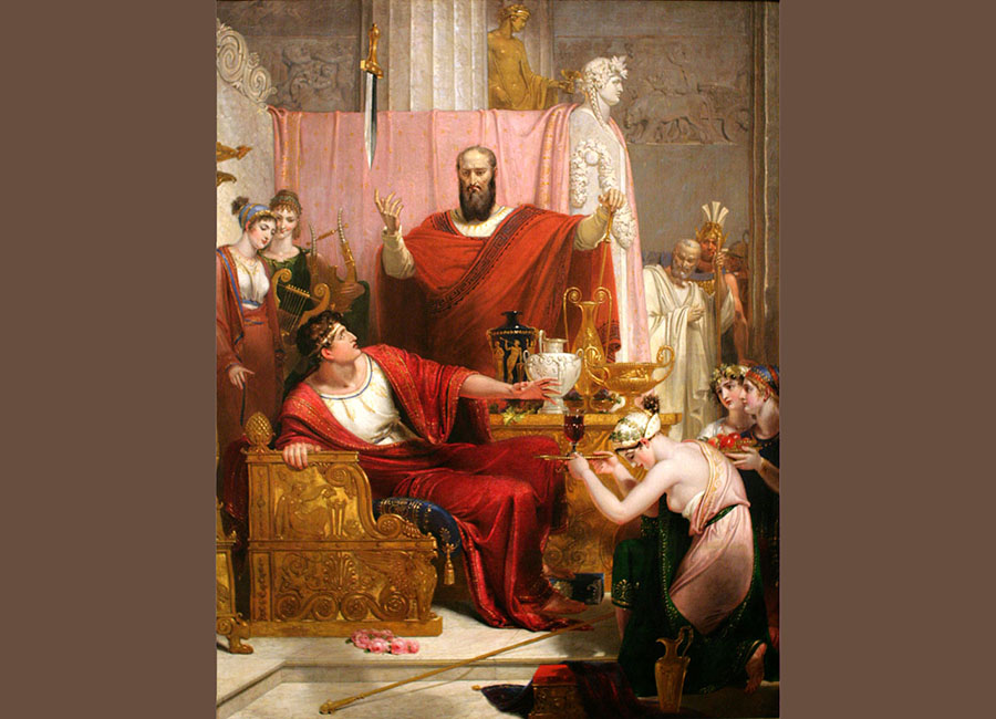 U jednome trenutku, dok je nazdravljao iz zlatnoga pehara, primijetio je kako mu iznad glave visi velik i kao britva oštar mač, obješen samo o jednu konjsku dlaku. Odmah se ukočio i problijedio. Odjednom je izgubio volju za slavljem i užicima. Rukom je dao znak glazbenicima neka prestanu sa svirkom, plesačima neka se izgube iz dvorane. Užasnut je gledao prema oštrici koja je visjela nad njegovom glavom samo o tankoj konjskoj dlaci. Nije se usudio napraviti nijedan nagli pokret kako njime ne bi uzbibao zrak te se tanka nit zanjihala i prekinula. Samo se želio kradom izvući iz dvorane, iz palače, da se nađe što dalje od toga mjesta. Nije više želio biti vladar niti kušati tu „sreću”.