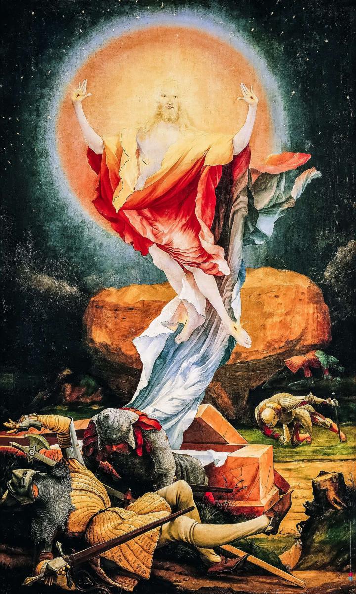 Od srednjovjekovlja postoji raširen motiv za Uskrsnuće – izlazak sunca. Njemački umjetnik Matthias Grünewald u svom djelu za oltar u Isenheimu otišao je korak dalje i prikazao Uskrsloga kao čisto svjetlo. Njegovo tijelo zrači bijelom i sunčano-žutom bojom i okružen je narančastim obručem svjetlosti. Njegova glava kao da se stapa sa suncem. Krist promatraču pokazuje svoje ranjene ruke, a umjetnik ih je još istaknuo malim svjetlosnim krunama. Time je naglašeno kako bez križa nema ni otkupljenja. Slika ujedinjuje tri misterija – Uskrsnuće, Uzašašće i Preobraženje. I dok Krist uzlazi iz groba, vojnici potreseni padaju na tlo. Ukopni povoji mijenjaju boje – postaju plavi, zeleni, crveni i žuti.