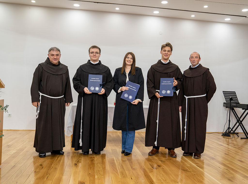Nazočnima se potom kratko obratio dekan Jozić, a zatim je uslijedila podjela diploma ovogodišnjim magistrima fra Danijelu Lukiću, Barbari Tolo i fra Hrvoju Žabiću, a potom i podjela nagrada studentima koji su u prošloj akademskoj godini ostvarili najbolji prosjek ocjena: fra Ante Pavić (9,3); fra Dario Laštro (9,5); fra Matej Juričević (9,63); fra Tonči Šarić (9,81) i fra Hrvoje Žabić (10,0).Na kraju su četvorica bogoslova iz afričkih zemalja koji od ove godine studiraju na Franjevačkoj teologiji izveli skladbu koja u prijevodu na hrvatski jezik glasi Ne mogu otići bez zahvale Bogu.
