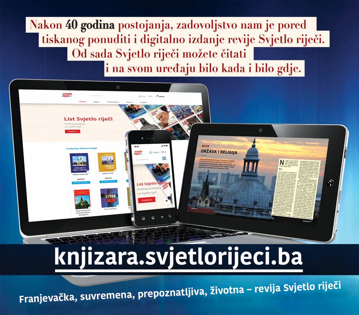 U web knjižari (https://knjizara.svjetlorijeci.ba) sada se još jednostavnije možete pretplatiti na tiskano izdanje revije Svjetlo riječi koja se dostavlja diljem svijeta na željenu adresu. Na istom mjestu možete također naručiti knjige u izdanju Svjetla riječi te devocionalije i to samo u nekoliko jednostavnih koraka.