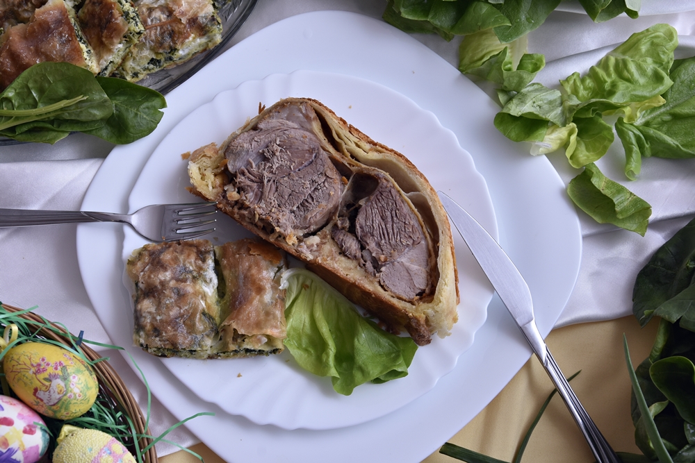 Zatim za 10 minuta ponovno razvaljamo tijesto na 1 cm te stavimo pečeno meso na tijesto, dobro ga zamotamo, namažemo jajetom, izbockamo vilicom, zatim stavimo u protvan obložen papirom za pečenje i pečemo u pećnici još 50 minuta na 200 C°. Pečeno meso poslužimo sa zelenom salatom, mladim lukom i pitom od špinata. Recept je prilagođen za svečani blagdanski stol.