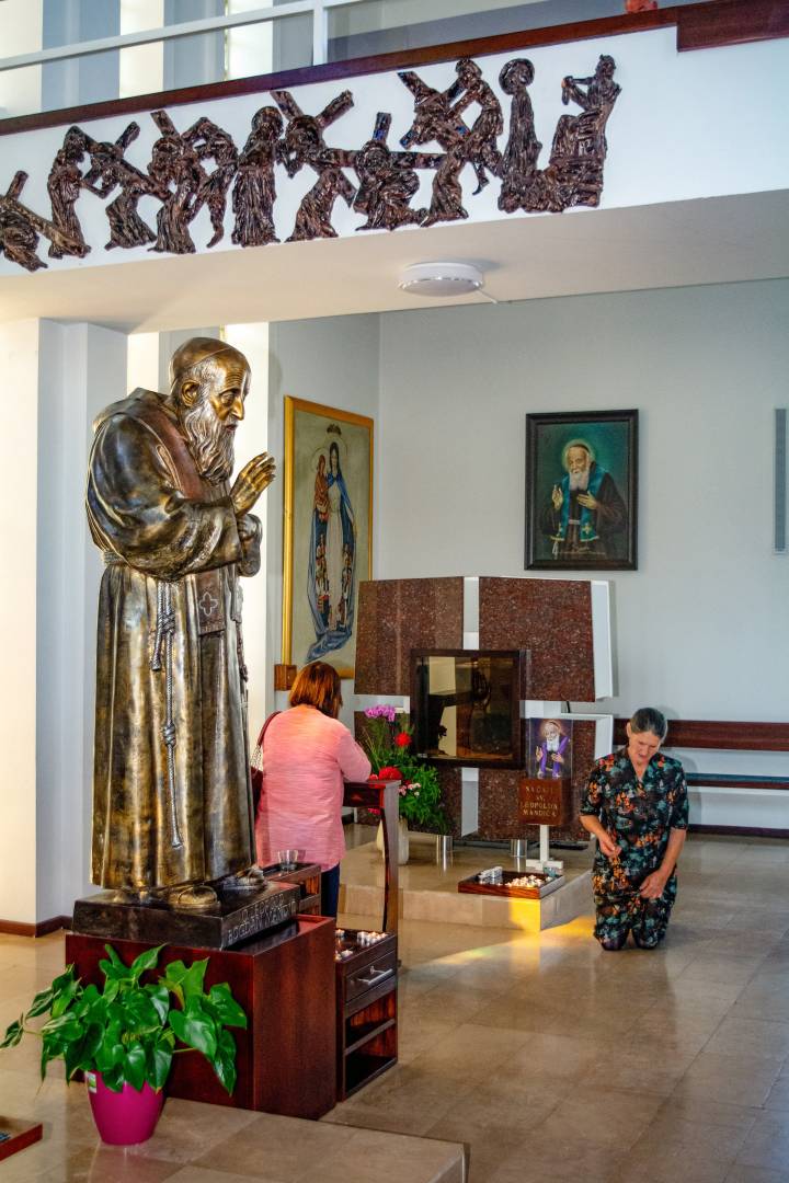 Župna crkva sv. Leopolda postala je uskoro prepoznatljivo i omiljeno Leopoldovo svetište, prvo u Crkvi u Hrvata i jedino u BiH, mjesto hodočašća i brojnih ispovijedi. Za one koji su naviknuli da su crkve široke i prostrane, ova je u neku ruku u graditeljskom smislu neobična jer je na kat. Budući da je za njezinu gradnju prostor očito bio ograničen, vlč. Bakoviću i inženjerima nije preostalo drugo nego da s unutarnjim prostorom odu u visinu, opasujući uski uzdignuti oltarski prostor i središnju lađu polukružnom širokom galerijom za smještaj vjernika što je stvorilo zanimljiv dojam teatra. Kako se crkvu i svetište dograđivalo te dalje umjetnički uređivalo, tako se učvršćivalo i štovanje ovoga sveca. U zadnjih 40 godina ovdje se tako razvila nova pobožnost Leopoldovih srijeda. Vjernici koji dođu, a rujanske srijede kada su nastale fotografije iz svetišta koje vidite bilo ih je više od 70, najprije imaju priliku za svetu ispovijed što je u duhu Leopoldove životne karizme. Potom se u 11 sati slavi zavjetna sveta Misa te se nakon nje sudjeluje u pučkoj pobožnosti pred moćnikom u kojem se nalazi relikvija svečeve desne ruke, poznate po tome što se tisućama i tisućama puta podigla u zrak kod molitve odrješenja od grijeha. Ne slučajno na umjetnički izrađenom relikvijaru ispisane su krupnim slovima upravo ispovjedničke riječi Ego te absolvo (I ja te odrješujem) dok je ispovjedaonica u kutu svetišta načinjena prema onoj u Padovi u kojoj je Leopold ispovijedajući druge, sebe posvetio. Sve je u svetištu, dojam je, tako uređeno pa i sama sakralno-umjetnička djela, kako bi se vjerniku pomoglo da se skruši te nađe i dobije od Boga po sakramentu pomirenja mir i oproštenje zbog kojih je i došao.