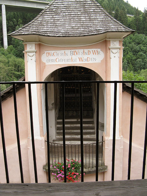 Druga jedna teorija, nastavlja Fritz, govori da je ovaj križ označavao granicu mjesne zajednice. „Svatko tko bi ovamo dolazio sa sjevera, znao bi da se od toga trenutka nalazi na području zajednice i podliježe pravima Gmünda. Isto tako, kad bi netko bio osuđen na smrt, prošao bi upravo ovim putem. Tako su kod križa osuđenici mogli izmoliti posljednju molitvu prije vješanja”, objašnjava Fritz. Oko 1784. godine ovaj je križ uklonjen, a na njegovu mjestu izgrađena je crkva. U apsidi stoji naslov „DVRCH SEIN BLVT SIND WIR GERECHTFERTIGT WORDEN” (Njegovom smo krvlju opravdani). Ovaj natpis na njemačkom jeziku predstavlja kronogram u kojemu su sadržane rimske znamenke DVCILVIDWICIWD. Pritom je W vrijednosti dvaju slova V, odnosno broja pet. Zbroj tih brojeva iznosi 1784.