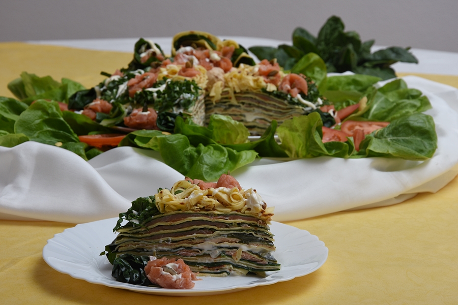 Na tanjur slažemo: jedna palačinka, premaz sosa, dimljeni losos, listovi blitve i tako do kraja, dok ne potrošimo materijal. Složenu tortu ohladimo u hladnjaku i prije posluživanja ukrasimo po želji.