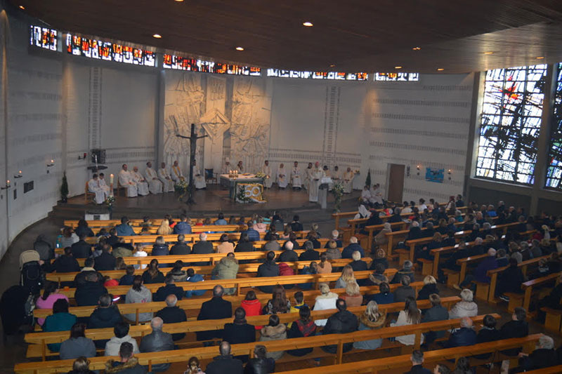 U duhu misnoga evanđelja, u homiliji je biskup Petanjak naglasio kako je evanđelje ono što oblikuje čovjeka, kršćanina. No, vjernike je podsjetio kako ih u Njemačku nisu natjerale nikakve duhovne vrednote, već su došli radi boljega života. „Drago mi je da vas vidim u ovakvome broju, no žao mi je da vas ovdje vidim. Volio bih vas vidjeti u Hrvatskoj, ali ja vam ne mogu obećati posao koji vam ne mogu dati. No, vi se ovdje morate pitati ‘je li ja živim u istini, jesam li ja slobodan’, jer Isus je rekao ‘istina će vas osloboditi’. Ne dajte se ovdje zarobiti: poštujte ovu zemlju kao svoju drugu domovinu, jer vam daje kruh, bolji standard. Uključite se u ovu zemlju, neka vide Nijemci da mi Hrvati imamo nešto dati, ne samo primati. Imamo mi našu kulturu, pismenost, običaje, tradicije: imamo čime doći pred Europu. Budite pošteni građani, budite dobri radnici, ali nemojte dozvoliti da ovdje izgubite svoje kršćanske korijene. Ne dajte se bilo čime i bilo kime zarobiti. Morate biti slobodni, jer Isus želi slobodne ljude, one koji stoje uspravno, koji žive i dišu punim plućima.“ Biskup je izrazio zahvalu sadašnjem župniku i svim svećenicima koji su djelovali i koji vode brigu za naše vjernike izvan domovine. „Oni su tu radi vas, no i vi se pitajte ‘što ja mogu učiniti za tu kršćansku zajednicu, čime ja mogu doprinijeti da te zajednica ide naprijed, da raste, da nam svima bude ljepše. To je smisao proslave ovih 50 godina, i neka to bude jedan novi početak, novi zamah, neka to bude u vama radost, veselje koje će vas podržavati da se ovdje ne izgubite“.