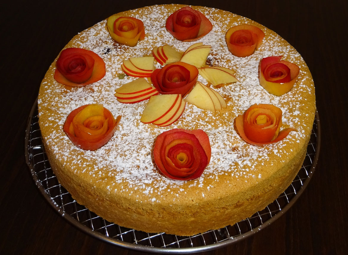Jaja razdvojite na bjelanjke i žumanjke. Bjelanjke umutite u čvrsti snijeg s polovinom šećera a drugu polovinu šećera i vaniliju stavite u žumanjke i mutite ih mikserom dok smjesa ne naraste i zapjeni. U žumanjke najprije dodajte u tankom mlazu ulje a zatim mlijeko. U brašno umiješajte prašak za pecivo pa odmah polovinu brašna stavite u smjesu sa žumanjcima i dobro izmiješajte. Drugu polovinu brašna lagano umiješajte u žumanjke naizmjenice sa snijegom od bjelanjaka. Jabuku ogulite i izribajte na krupni ribež. Dodajte joj ribanu koricu od limuna i cimet pa sve spojite s biskvitnim tijestom. Kalup za torte promjera 28 cm namažite maslacem i pospite brašnom. Pripremljeno tijesto izlijte u kalup i pecite na srednje jakoj vatri oko 40 minuta. Ispečen kolač izvadite na rešetku da se hladi, a hladnog ga pospite šećerom u prahu i poslužite uz kavu. Ako želite ukrasite kolač kriškama jabuka ili ružama napravljenim od jabukove kore.