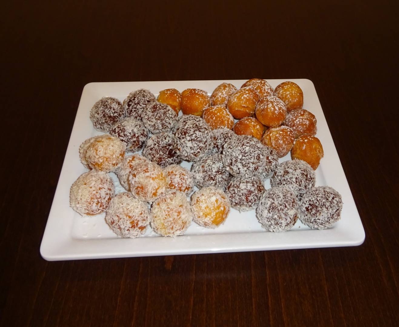 Priprema: Mlijeko i slatko vrhnje stavite na peć da se zagrije samo toliko da je toplo. U malo zagrijanog mlijeka izmrvite kvasac, dodajte mrvicu šećera i žličicu brašna pa stavite na toplo mjesto da nadolazi. U brašno dodajte sve suhe sastojke. Izlijte u njega nadošli kvasac. U mlijeko dodajte jaja, rum, ulje i otopljeni maslac te umijesite tijesto. Tijesto treba biti malo tvrđe. Dobro ga umijesite da bude glatko. Oblikujte od tijesta kruščić, pokrijte i ostavite da nadolazi. Nadošlo tijesto istresite na radni stol i podijelite u tri dijela. Zatim svaki dio oblikujte u tanji valjak i režite tijesto u male komadiće veličine oraha, a potom ga dlanovima oblikujte u kuglicu. Stavljajte ih na pobrašnjenu tacnu, pokrijte i pustite da tijesto još jednom uzađe i dobije izgled prave kuglice. Pržite ih na zagrijanom ulju dok ne porumene sa svih strana.