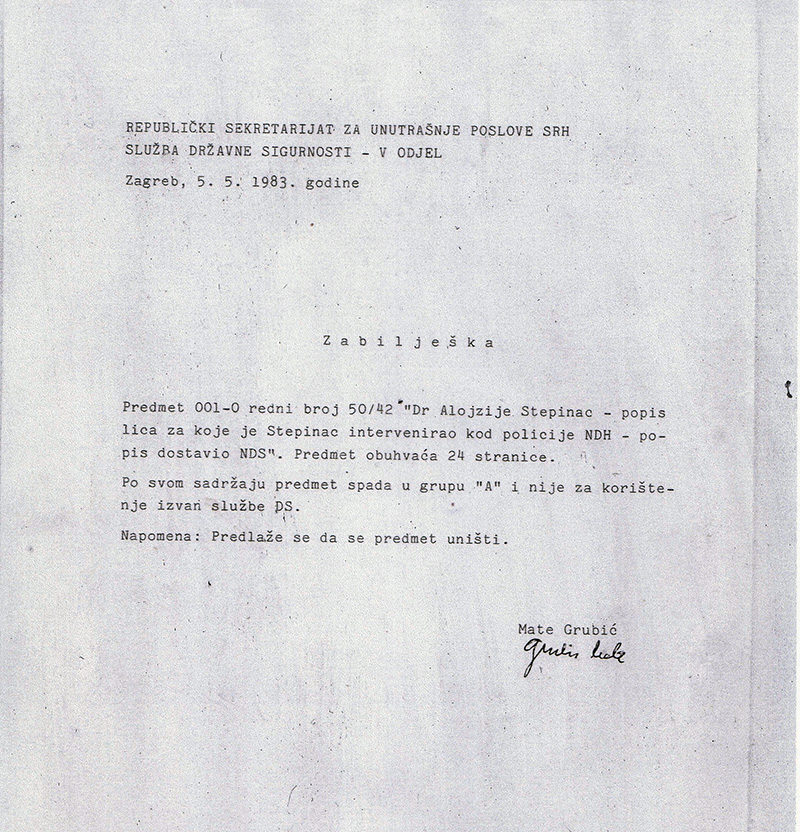 Selektirajuće je prošla i dokumentacija jugoslavenske tajne policije OZN-e (Odjeljenje za zaštitu naroda), a od 1966. godine UDBA-e (Uprava državne bezbednosti), pohranjena u Stepinčev dosje, koja je probrana, jednim dijelom uništena, a dijelom još uvijek nedostupna, posebice dio odnesen u saveznu UDBA-u u Beograd. Taj je Stepinčev dosje, prema dostupnim dokumentima u Hrvatskome državnom arhivu, najvjerojatnije, prvo 1973. godine prošao kroz „sito i rešeto”, tj. djelomično i uništen pod budnim okom UDBA-ina djelatnika Stjepana Balenta, i kasnije 1983. godine po izravnim preporukama Mate Grubića. Za ilustraciju, iz mnoštva Grubićevih preporuka s istim ciljem – zatiranje svih tragova, dobro je citirati barem jednu od njih, nakon kojega je svaki komentar suvišan: