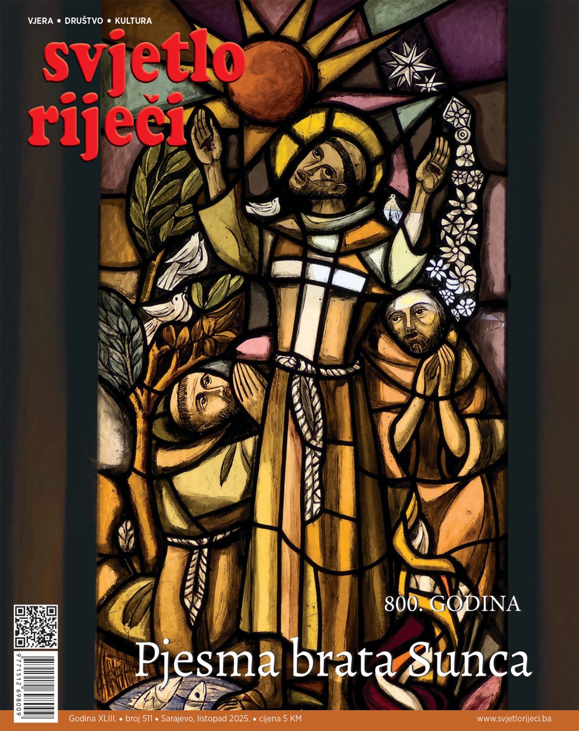 Glavna tema našega broja za mjesec listopad je “Pjesma brata Sunca” ili “Pjesma stvorenja” sv. Franje Asiškog, čiju 800. obljetnicu nastanka slavimo ove godine kao veliki franjevački jubilej. Njezina je specifičnost u tome što je napisana na narodnom jeziku, umbrijskom talijanskom, jeziku kojim se Franjo služio u svoje vrijeme, te je sv. Franjo na određen način otac talijanske književnosti. Franju je inače pjesma pratila cijeli njegov život. Svoju radost pokazivao je pjesmom. Pa čak i u trenucima bolesti, napuštenosti i tjeskobe Franjo koristi pjesmu kao oružje protiv napasti žalosti i tuge. Franju je pjesma oslobađala, otvarala njegov duh divljenju, vraćala mu mladost i radost srca. Na koncu, svoj ovozemaljski put završio je u pjesmi. “Pjesma brata Sunca” uzvišena je molitva Stvoritelju napisana u stihovima, nastala iz Franjinog dubokog mističnog iskustva. U njoj se može iščitati snaga Franjina susreta s Bogom kroz stvorenja. Ona i danas fascinira cijeli svijet. Tekst propituje, poziva i izaziva slušatelja i čitatelja pjesme, te budi kreativnost onoga koji ga sluša