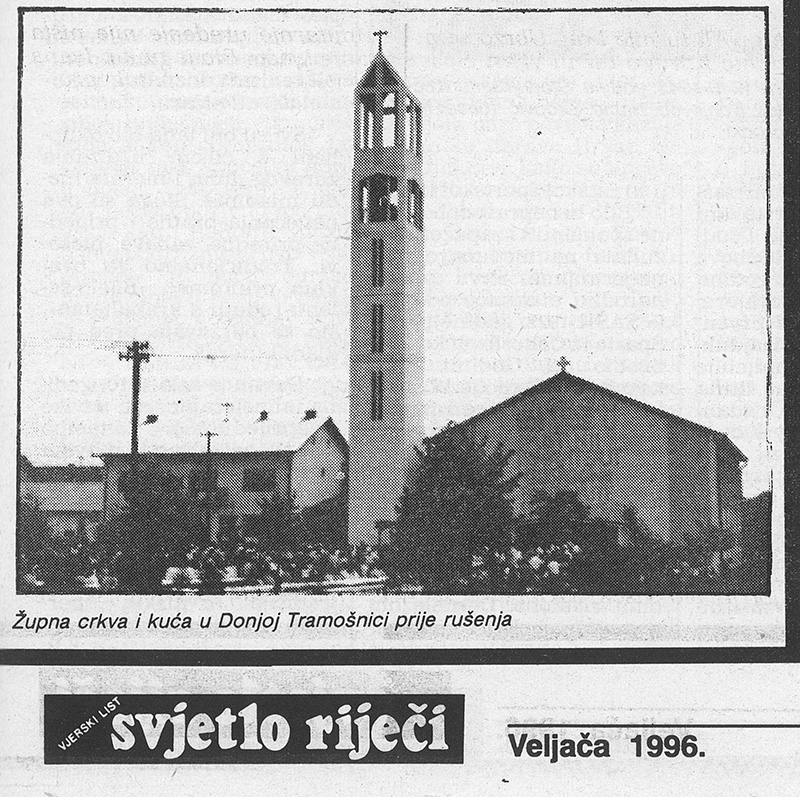 Zadnja koja je budila nadu svećenika bila je tramošnička crkva. O njoj su dolazile različite vijesti; čas da je netaknuta, a čas da je sravnjena sa zemljom. Tako je igra vrućeg i hladnog trajala do svibnja ’95. Stigla je fotografija. Kao i prethodne dvije i ova crkva je minirana. Svećenik je držao fotografiju objema rukama, kao da je u trenu naglo otežala, pognuo se kao otac kad izgubi sina i tiho progovori. „Ja… Ja sam je zvao tramošnički obelisk, znate, zvonik joj je bio visok 30 metara. I… I unutarnje uređenje nije ništa manje lijepo. Bio je tu kip Ivana Krstitelja, rad poznatog profesora Josipa Poljana, četrnaest skupina skulptura u bronci koje predstavljaju – Put križa, freska Josipa Bifela u kajm tehnici površine 107 četvornih metara koja predstavlja Krista i apostole. Na kraju tu je bila i poruka na ulazu u crkvu kojom Izaija najavljuje dolazak Ivana Krstitelja, koja bi zaustavila i ruku samoga Sotone: ‘Ja sam glas koji viče u pustinji, pripravite pripravite put Gospodnji, poravnajte staze njegove+ ali nije zaustavila ruku bezumnog rušitelja TRAMOŠNIČKOG OBELISKA. On je sada samo hrpa polomljenog betona, opeke i stakla.